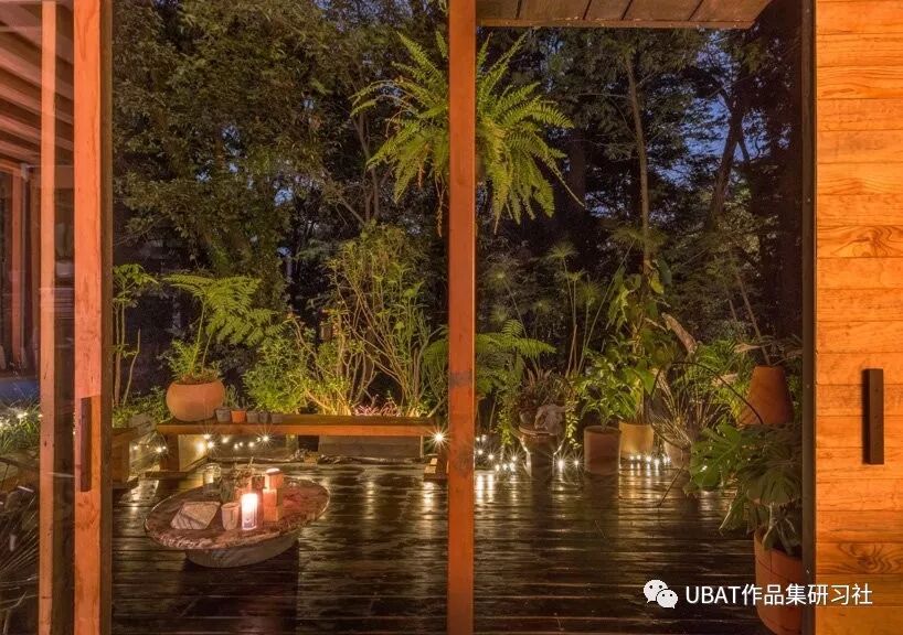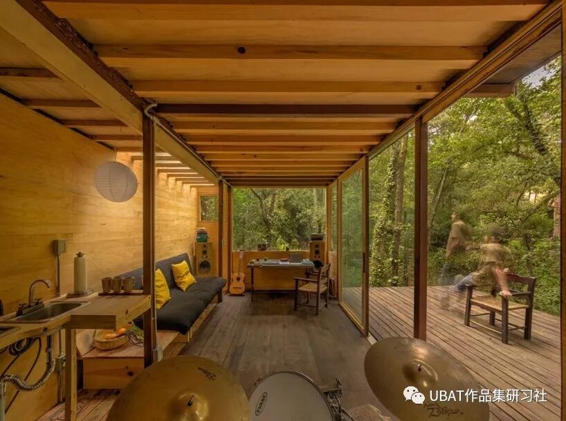 大型落地窗和天窗照亮了树屋每一个角落,为了突出和周围环境的关系,树屋从内到外全部使用木制材料搭建而成。
