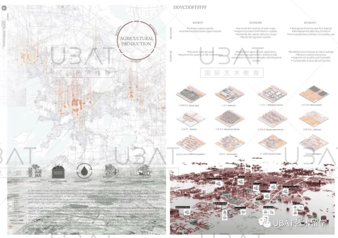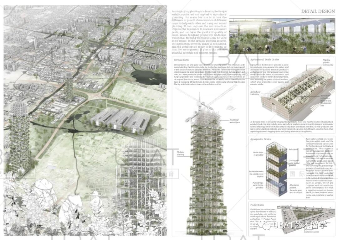 所以四个主要项目分别是:城市空间的社交隔离、都市农业景观、运河复兴水上集市还有海洋生态景观。这样子的项目尺度规划,就能多角度地展现出专业能力,既有宏观分析又有细化设计。