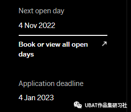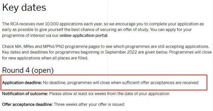 皇家艺术学院(RCA)悄悄地在官网公布了deadline日期。目前,皇艺在各个专业页面都更新了报名截止时间——均在2023年1月4日!首先,申请皇艺的同学一定要时刻关注自己的申请动态,以及皇艺官网信息的变化。皇艺近两年经常搞“临时更改申请要求”、“临时提前deadline”的事情,以2022年的申请为例,一般情况下, 皇艺的申请截止日期都是在1月下旬到2月上旬左右就截止了。但2022年,当所有人都以为申请已经截止的时候,皇艺莫名其妙开放了第四轮申请,而且没有deadline!就比如2022季虽然取消了 deadline,结果2023申请季的 deadline 很快就出来了,谁又敢保证它会不会再发生什么改变呢?