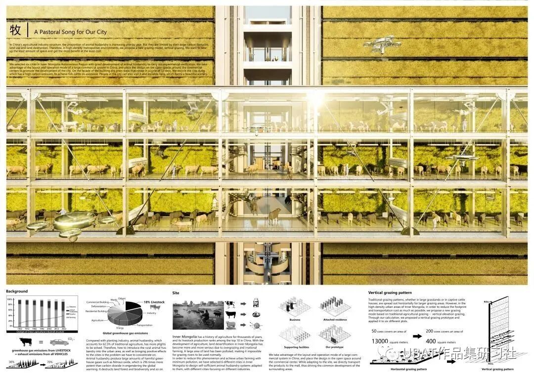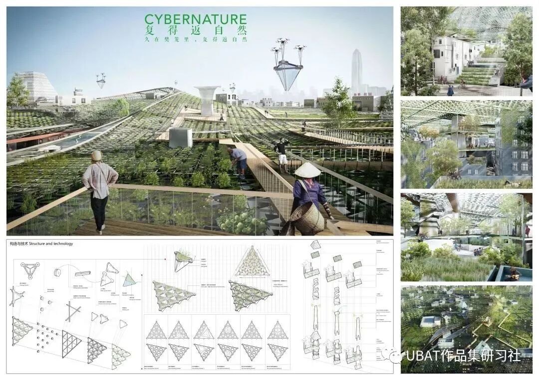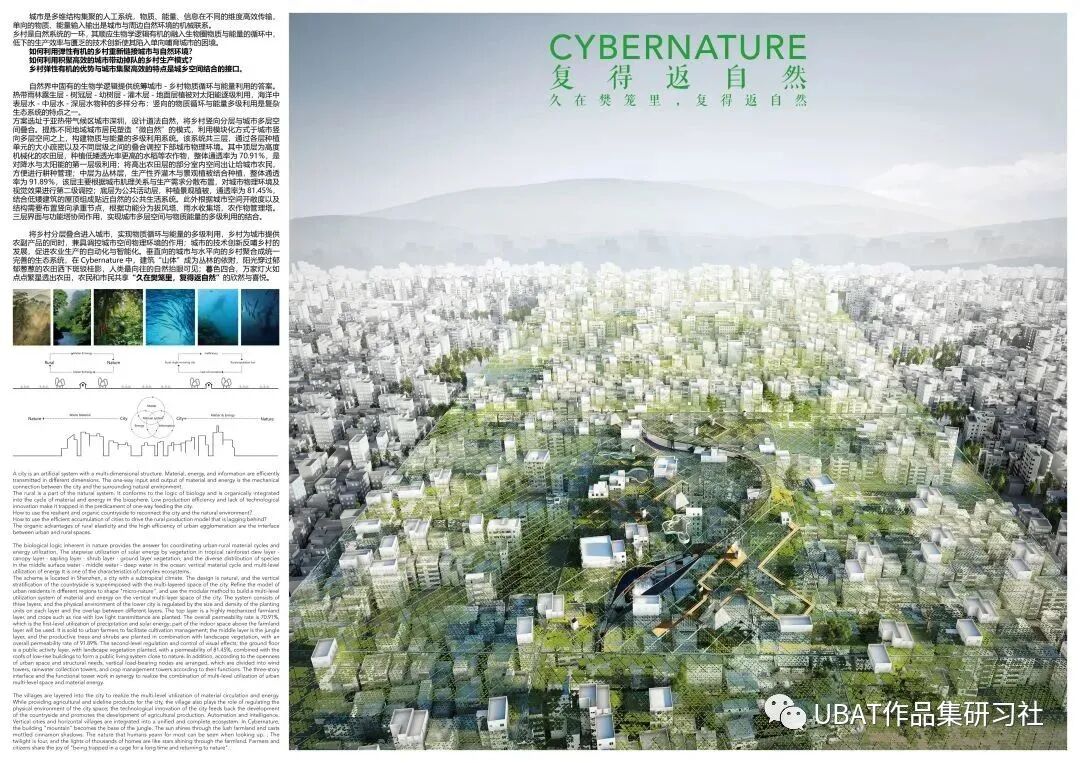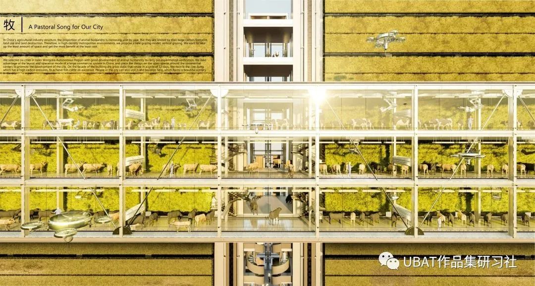 城市是多维结构集聚的人工系统,物质、能量、信息在不同的维度高效传输,单向的物质、能量输入输出是城市与周边自然环境的机械联系。乡村是自然系统的一环,其顺应生物学逻辑有机的融入生物圈物质与能量的循环中,低下的生产效率与匮乏的技术创新使其陷入单向哺育城市的困境。如何利用弹性有机的乡村重新链接城市与自然环境?如何利用积聚高效的城市带动掉队的乡村生产模式?乡村弹性有机的优势与城市集聚高效的特点是城乡空间结合的接口。自然界中固有的生物学逻辑提供统筹城市-乡村物质循环与能量利用的答案。热带雨林露生层-树冠层-幼树层-灌木层-地面层植被对太阳能逐级利用,海洋中表层水-中层水-深层水物种的多样分布:竖向的物质循环与能量多级利用是复杂生态系统的特点之一。方案选址于亚热带气候区城市深圳的南头古城,设计道法自然,将乡村竖向分层与城市多层空间叠合。提炼不同地域城市居民塑造“微自然”的模式,利用模块化方式于城市竖向多层空间之上,构建物质与能量的多级利用系统。该系统共三层,通过各层种植单元的大小疏密以及不同层级之间的叠合调控下部城市物理环境。其中顶层为高度机械化的农田层,种植低矮透光率更高的水稻等农作物,整体通透率为70.91%,是对降水与太阳能的第一层级利用;将高出农田层的部分室内空间出让给城市农民,方便进行耕种管理;中层为丛林层,生产性乔灌木与景观植被结合种植,整体通透率为91.89%,该层主要根据城市肌理关系与生产需求分散布置,对城市物理环境及视觉效果进行第二级调控;底层为公共活动层,种植景观植被,通透率为81.45%,结合低矮建筑的屋顶组成贴近自然的公共生活系统。此外根据城市空间开敞度以及结构需要布置竖向承重节点,根据功能分为拔风塔、雨水收集塔,农作物管理塔。三层界面与功能塔协同作用,实现城市多层空间与物质能量的多级利用的结合。将乡村分层叠合进入城市,实现物质循环与能量的多级利用,乡村为城市提供农副产品的同时,兼具调控城市空间物理环境的作用;城市的技术创新反哺乡村的发展,促进农业生产的自动化与智能化。垂直向的城市与水平向的乡村聚合成统一完善的生态系统,在Cybernature中,建筑“山体”成为丛林的依附,阳光穿过郁郁葱葱的农田洒下斑驳桂影,人类最向往的自然抬眼可见;暮色四合,万家灯火如点点繁星透出农田,农民和市民共享“久困樊笼里,复得返自然”的欣然与喜悦。作品:《A Pastoral Song for Our City | 牧》