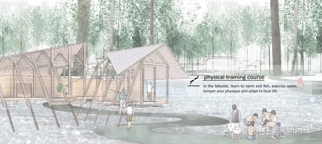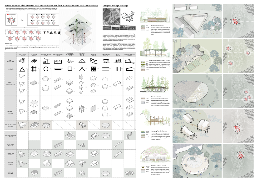 方案选取了中国江西的一个普通乡村进行实例说明。根据该乡村的民俗文化和田林湖草等自然资源,详细设计了五种课程及其建筑形式,并采用竹、木、石等乡土材料建构。在田埂上,树林间,小溪旁......孩子们以自然为师,以乡村为课堂。无形之中,乡村不再是城市的补给者,在自身恢复活力的同时,也成为自然教育的特有场所。乡村,与教育一样,得以薪火相传。黄路遥、王居鹏、刘骥鑫、郑晓琪