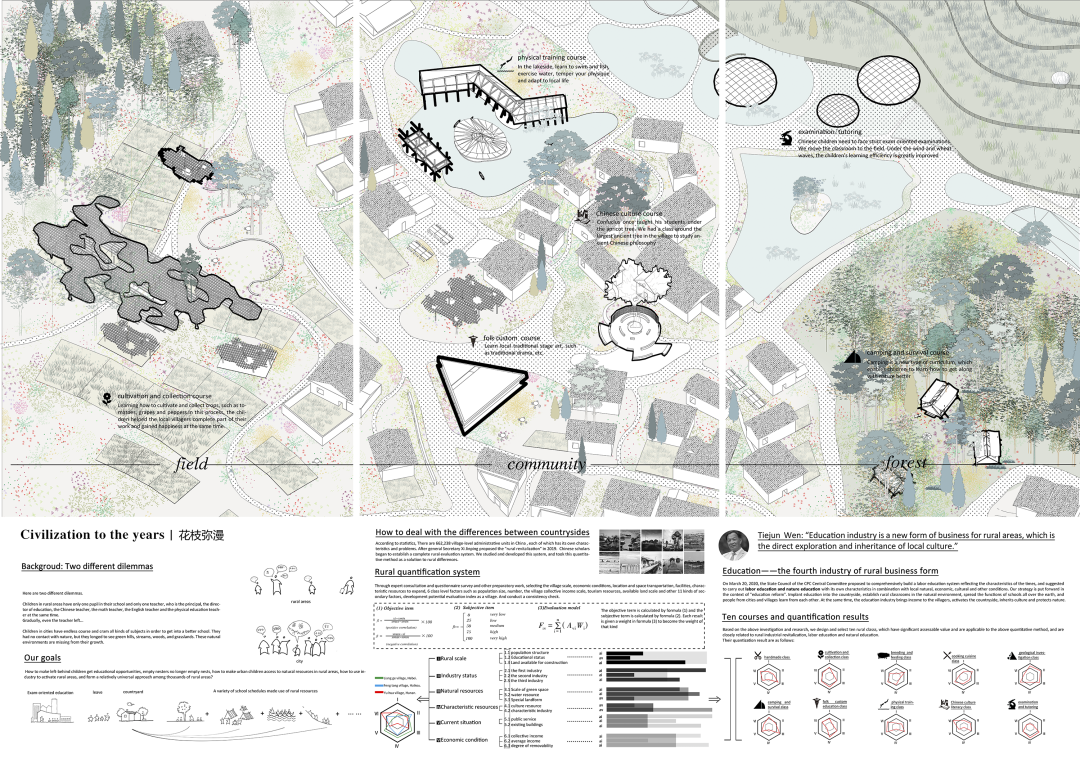 作品:《Civilization to the years | 花枝弥漫》本方案将“教育产业”作为乡村振兴的切入点,旨在以“自然教育”作为乡村的第四产业,将教育植入乡村,在自然环境中建立新型乡村课堂,使学校的功能散布于大地各处,来自城市和乡村的人群相互学习。