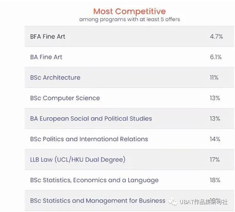 例如伦敦大学学院院,可以看到艺术相关专业竞争最为激烈,纯艺录取率仅有4.7%。 并且在入学要求方面伦敦大学学院也不含糊,建筑专业A-level最低成绩要求介于A*A*A-AAB之间,个别课程要求低于或高于这一标准。 随着近两年竞争愈发激烈,经常出现A*A*A*依旧被拒的情况,大家想申请G5还是需要从多方面提升自己的综合实力。